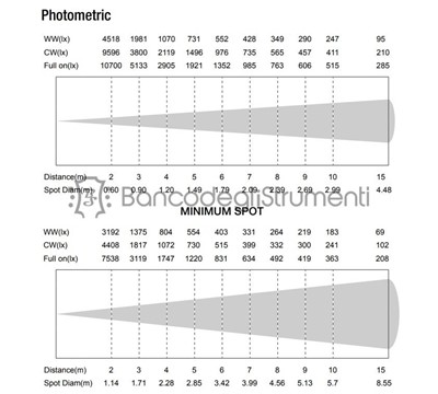 Light source: Single colour LED LED colours: Warm White LED power: 200 Colour temperature: 3200K Quantity of LEDs: 1 Beam angle: Min 18 Beam angle: Max 36 Illuminance: 68443 lx (zoom in) Flash rate per second: 1 - 19Hz DMX channels: 1, 2, 3 DMX connector: 3-pin XLR Modes: DMX, Manual IP rating: IP20 Power plug: Power-connector Power consumption: 1.64 - 0.81A Power supply: 100-240VAC 50/60Hz Dimensions (L x W x H): 745 x 294 x 294mm Weight: 8,80 Accessories: Mounting bracket, Power cable, Safety cord