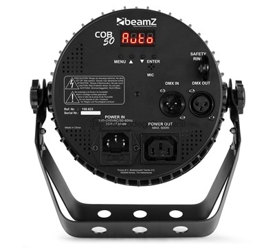 1x LED COB da 50 W Spettro luminoso completo con tecnologia COB Modalità DMX e stand-alone 9 canali DMX Suono attivato con sensibilità regolabile Modalità automatica con velocità regolabile Spettacoli preprogrammati Ingresso/uscita DMX tramite XLR a 3 pin Ingresso/uscita connettore IEC Pannello di controllo con display a LED La doppia staffa funge anche da supporto da pavimento