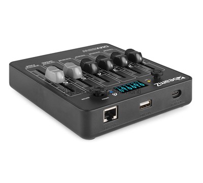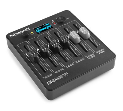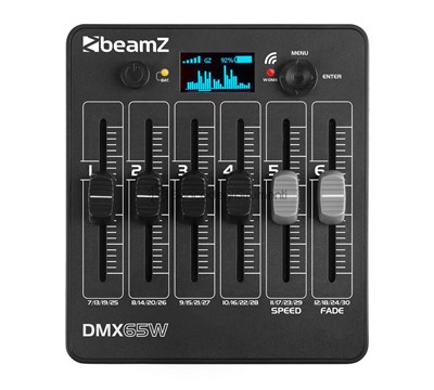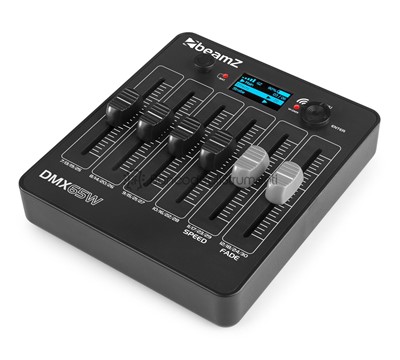 Controller 6 fader: DMX65W è un mixer luci compatto, appositamente progettato per l'utilizzo complementare a, per esempio, Uplighters wireless BeamZ.