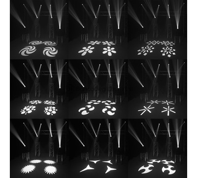Light source: Single colour LED LED colours: White LED power: 180W Quantity of LEDs: 1 Colour wheel: 7 colours + open Dispersion: 15° Illuminance: 131.000lx@1m Head movement: Pan 540 Head movement: Tilt 270 Static gobo: Quantity 15 Rotating gobos: Quantity 6 Gobo shake: Yes Interchangeable gobos: Yes Gobo dimensions: 21mm Prisma: 1 3 Facet Prisma: 2 6 Facet Flash rate per second: 0 - 20Hz Modes: Automatic programs, DMX, Manual Sound to light mode: Yes DMX channels: 13, 17 DMX connector: 3-pin XLR Display: LCD IP rating: IP20 Cooling: Temperature controlled fan Power plug: Power-connector Power consumption: 2 - 0.98A Power supply: 100-240VAC 50/60Hz Dimensions (L x W x H): 320 x 220 x 360mm Dimensions: Flightcase 620 x 370 x 480mm Weight: 35,60 Weight: Each 10.2 Accessories: DMX cable, Mounting bracket, Power cable
