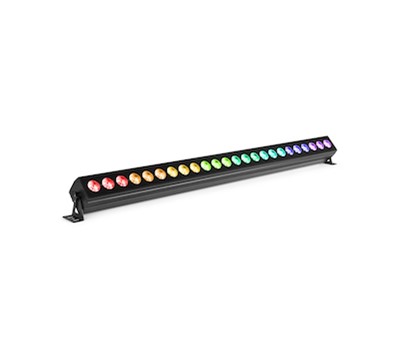 Supplied features Master/Slave mode Light source 6-in-1 LED LED colours Red, Green, Blue, Amber, White, Ultra Violet LED power 6W Quantity of LEDs 24 Beam angle 20 Field angle 33 Illuminance 5.675 lx @ 1m Flash rate per second 1 - 20Hz DMX channels 8, 11, 20, 36, 74 DMX connector 3-pin XLR Modes Automatic programs, DMX, Manual, Master/Slave Daisy chain Yes (max. 8 bars) IP rating IP20 Cooling Temperature controlled fan Display LED Power plug Power-connector Power consumption 1.70 - 0.90A Power supply 100-240VAC 50/60Hz Dimensions (L x W x H) 1010 x 75 x 76mm Weight 3,65 Accessories Mounting bracket, Power cable