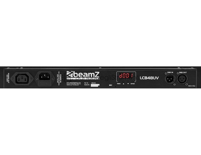 Light source: Single colour LED LED colours: Ultra Violet LED power: 3W Quantity of LEDs: 18 Beam angle: 120° DMX channels: 9 Power consumption: 50W Power supply: 100-240VAC 50/60Hz Dimensions (L x W x H): 950 x 50 x 80mm Weight: 2,15