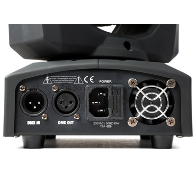 Light source: Single colour LED LED colours: White LED power: 45W Quantity of LEDs: 1 Colour wheel: 7 colours + open Beam angle: 11 Field angle: 12 Illuminance: 22.000 lx @ 1m Head movement: Pan 540 Head movement: Tilt 180 Static gobo: Quantity 7 gobos + open Flash rate per second: 0 - 10Hz Modes: Automatic programs, DMX DMX channels: 9, 11 DMX connector: 3-pin XLR Power plug: IEC Power consumption: 50W Power supply: 100-240VAC 50/60Hz Dimensions (L x W x H): 145 x 172 x 240mm Weight: 3,30