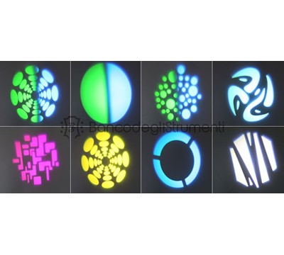 La ruota gobo ha 7 diversi gobo + aperti e la ruota dei colore ha 7 colori + bianco.
