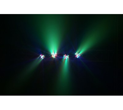 4 lattine PAR con 3 LED rossi da 1 W, 3 LED verdi da 1 W e 3 LED blu da 1 W 4 Magic Ball con 1 LED rosso da 1 W, 1 LED verde da 1 W e 1 LED blu da 1 W 8 canali DMX Modalità DMX e stand-alone Telecomando IR Ingresso/uscita DMX tramite XLR a 3 pin Spettacoli preprogrammati Suono attivato Modalità automatica con velocità regolabile Pannello di controllo con display a LED Supporto luci incluso