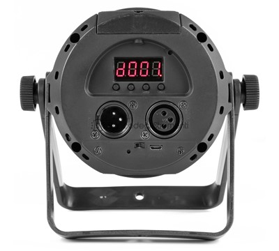 Light source Single colour LED LED colours: Red, Green, Blue, Ultra Violet LED power: 3W Quantity of LEDs: 4 DMX channels: 6 DMX connector: 3-pin XLR Modes: Automatic programs, DMX Battery: 3.7V - 2Ah Power supply: 5V via USB Dimensions (L x W x H): 130 x 160 x 115mm Weight: 0,60