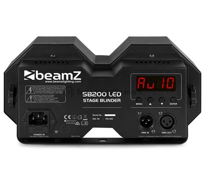 L'SB200 abbina l'emissione di luce accecante di un Audience Blinder convenzionale e può essere controllato in modalità stand alone, modalità di attivazione del suono o direttamente tramite DMX in una modalità a 6 canali.