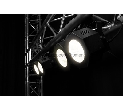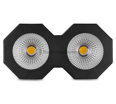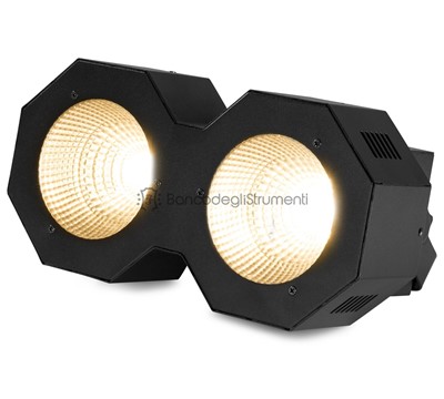 2x 50W COB LED 2-in-1: Stage Blinder and Strobe LED di colore bianco caldo 6 canali DMX DMX in/output via 3-pin XLR DMX, attivazione tramite suono e modalità Stand-alone Connettore IEC in input