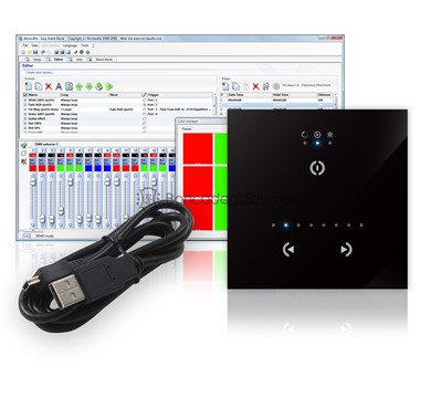 Controller DMX autonomo a parete Pannello di design in vetro con 3 pulsanti sensibili al tocco (86x86mm) 128 canali di uscita DMX24 Scene Memoria autonoma 2K Funziona con il software Easy Stand Alone: versioni ESA (PC) ed ESA2 (PC / MAC) STICK-GU2 non può essere controllato tramite rete ETHERNET e WIFI Fornito con un cavo micro USB