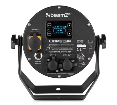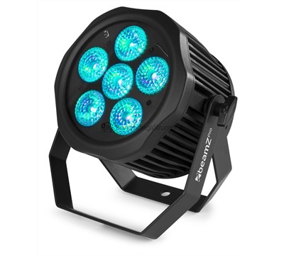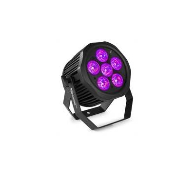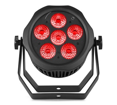 Supplied features: Master/Slave mode Light source: 6-in-1 LED LED colours: Red, Green, Blue, Amber, White, Ultra Violet LED power: 12W Quantity of LEDs: 6 Beam angle: 25 Field angle: 44 Illuminance: 6000 lx@1m DMX channels: 6, 12 IP rating: IP65 Cooling: Convection Display: oLed Power plug: Power-connector TR Power consumption: 0.4 - 0.2A Battery: 16.8V - 7.8Ah Power supply: 100-240VAC 50/60Hz Dimensions (L x W x H): 170 x 230 x 210mm Weight: 3,80 Accessories: Mounting bracket, Power cable, Remote control