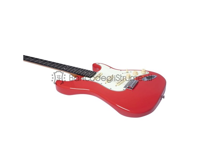 La Eko ST-300 Fiesta Red è la chitarra elettrica della serie "Tribute 300" di Eko Guitars, ispirata ai celebri modelli strato, in colorazione Red. Presenta corpo a doppia spalla mancante in pioppo, manico in acero e tastiera in resina Eko WPC (Wood Polymers Composite), con finitura gloss sia sul corpo, sia sul manico. Monta 3 pickup single-coil, controlli di Volume e due toni e switch blade a 5 vie. 22 tasti con dot, la scala è lunga 650 mm. L'hardware è cromato, il capotasto in plastica bianca e il battipenna è in bianco invecchiato.,Uno strumento pensato per offrire un look vintage ad un prezzo abbordabile.