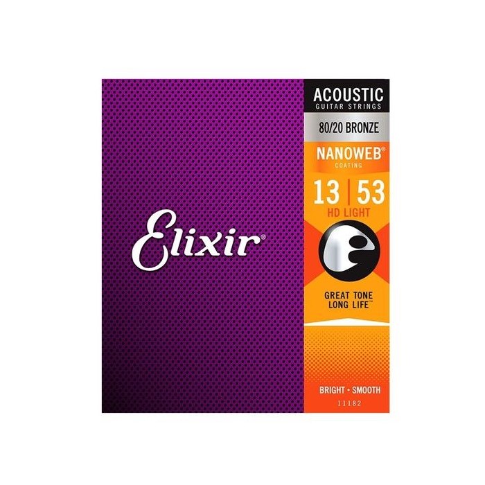 Le Elixir 11182 Nanoweb HD Light Acoustic 80/22 Bronze sono corde per chitarra acustica in Bronzo 80/20 con rivestimento NanoWeb che forniscono un suono brillante e preciso, assieme al sustain prolungato che i chitarristi si aspettano da corde Elixir.
