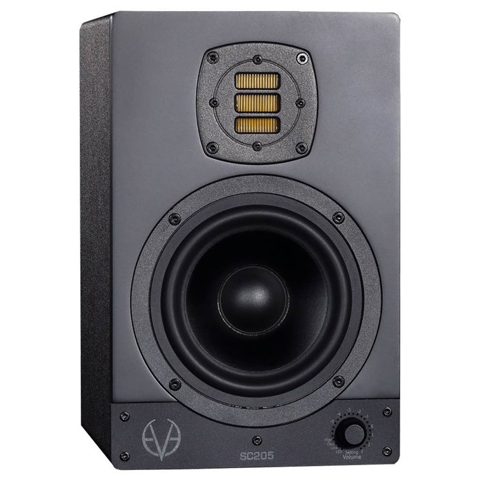 Eve Audio SC205 All Black Ed promo: Monitor da studio professionale, a due vie, attivo, dotato di woofer schermato da 5"" in fibra di vetro, tweeter a nastro con trasduttore Air Motion da 1"", pot posteriore, filtri basati su DSP per la regolazione della risposta in frequenza, push knob per il controllo del volume e della risposta acustica, convertitori A/D Burr-Brown di altissima qualità, ingresso analogico XLR bilanciato e RCA sbilanciato, risposta in frequenza 53Hz-21kHz, amplificatori distinti per bassi e acuti con potenza di 2x50W (picco) ciascuno, SPL 101 dB, pulsante on/off, inserti filettati nel pannello posteriore per il fissaggio a parete, su asta microfonica o stativo per speaker.