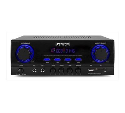 AV440 HiFi Amplifier 2x200W BT,IRC: L'AV440 è un moderno amplificatore per karaoke a 2 canali da 2x 200 W dotato di un lettore multimediale e pulsanti illuminati di blu.