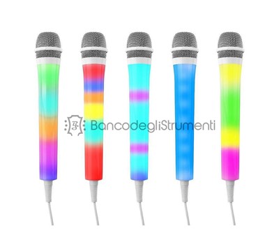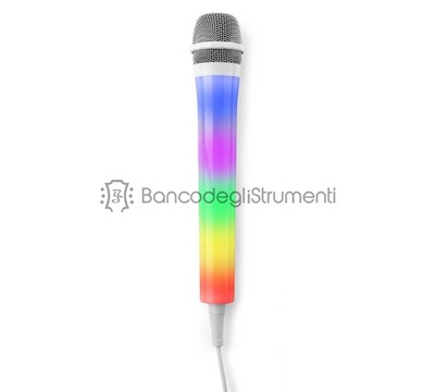 Microfono dinamico per karaoke e uso domestico Luci LED che cambiano colore in modo casuale o controllato dalla musica Include cavo da 3 metri con connessione jack standard da 6,3 mm Compatibile con tutti i sistemi musicali e karaoke La luce a LED funziona a batterie (3x AAA, incluse)
