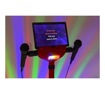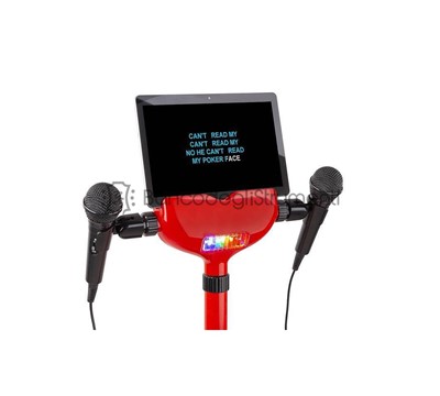 L'unità è dotata di due microfoni vocali palmari cablati e di un robusto supporto per smartphone o tablet, che consente a due artisti di amplificare le loro voci mentre cantano su tracce karaoke in streaming da un dispositivo abilitato BT.