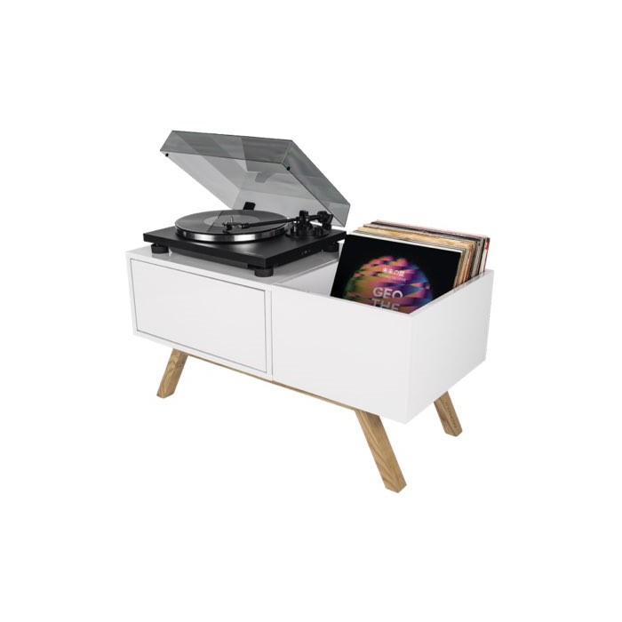 Glorious Turntable Lowboard: Elegante consolle dal design minimale e moderno per appassionati di dischi in vinile, pensata per essere utilizzata in casa ma non solo, dotata di piano per il posizionamento del giradischi, vano porta vinili e vano gli altri compenti del HiFi con anta aprible e foro passacavo sul pannello posteriore, costruzione solida in legno (MDF) con finitura laccata bianca e piedini in legno naturale.
