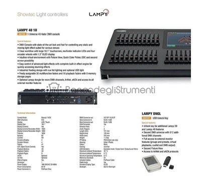La Showtec LAMPY 40 1U è una console DMX completa con un nuovo concetto di design moderno ed intuitivo per controllare proiettori mobili e statici in tanti contesti di applicazione.