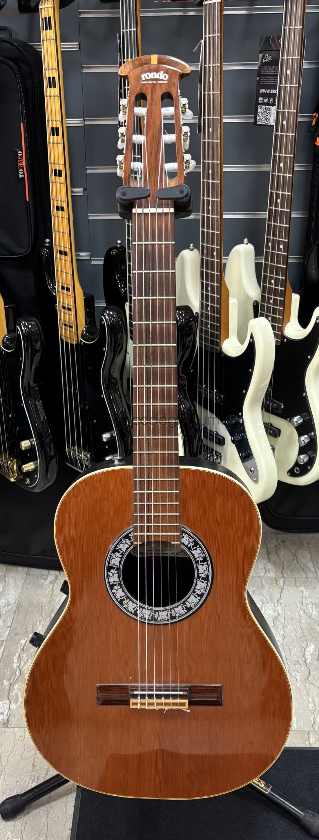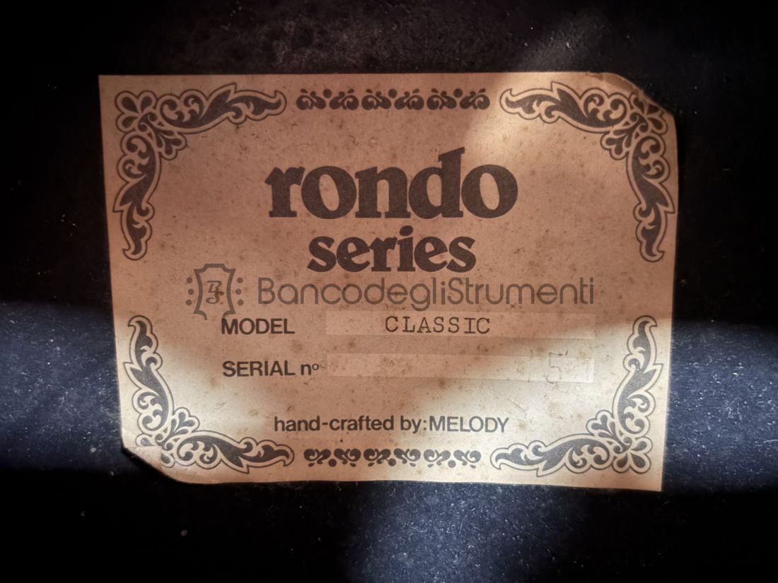 La Melody Rondo Classic è una chitarra classica a sei corde prodotta dal marchio italiano Melody negli anni Settanta, pensata per lo studio e per l’uso amatoriale ma con caratteristiche costruttive tipiche degli strumenti tradizionali.
