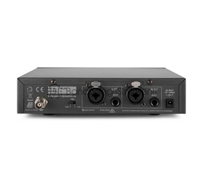 Gamma di frequenza: UHF 863 - 865 mHz Portata operativa massima di 80 m (in condizioni tipiche) Trasmissione dati IR per la selezione del canale Oscillatore PLL 20 canali selezionabili Robusto alloggiamento in metallo Funzione display LCD con retroilluminazione bianca Rapporto segnale/rumore: > 105dB Trasmettitore e ricevitore bloccabili Ingressi: XLR L + R e Jack da 6,3 mm L + R Uscita: jack da 6.3mm L+R Interruttore PAD 0 / -12dB Fornito in robusta valigetta di plastica Incluse staffe da 19"