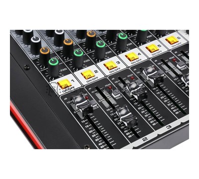 Le funzionalità includono interruttori "mute" e "solo" su ogni canale, lettore USB integrato con display digitale e ricevitore BT per la riproduzione di musica sul mixer durante le pause.