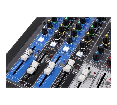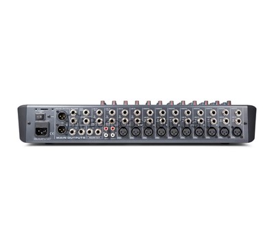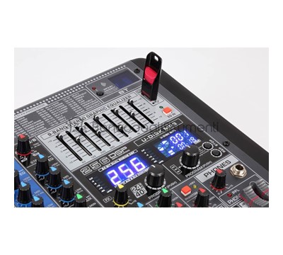 10 ingressi microfonici mono bilanciati (XLR) 8 ingressi di linea mono bilanciati (jack da 6.3 mm) 4 ingressi di linea stereo bilanciati (jack da 6.3 mm) Alimentazione phantom +48V Ingresso di linea stereo (RCA) Filtro Low Cut da 75Hz sui canali 1-8 Processore multi-FX con 256 preset Interruttore Solo per ogni canale (PFL) Interruttore On/off per ogni canale Controllo Hi, Mid e Low per ogni canale FX, Pan, Trim regolabili per ogni canale Aux send per ogni canale Equalizzatore a 9 bande Uscite principali stereo bilanciate (XLR + jack da 6.3 mm) Sala di controllo separata, uscite cuffie e stereo rec Lettore USB integrato con display digitale Ricevitore BT per streaming audio VU meter LED e Peak LED Portatelefono incluso