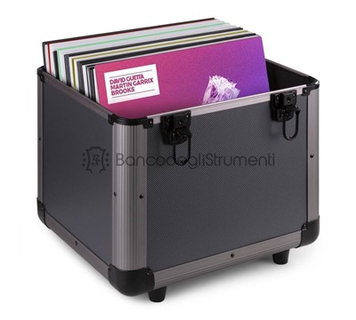 Finitura titanio Foderato in gommapiuma 2 chiusure bloccabili Impugnatura morbida Contiene dischi in vinile / LP da 12"" Piedini di gomma Impilabile Coperchio completamente removibile