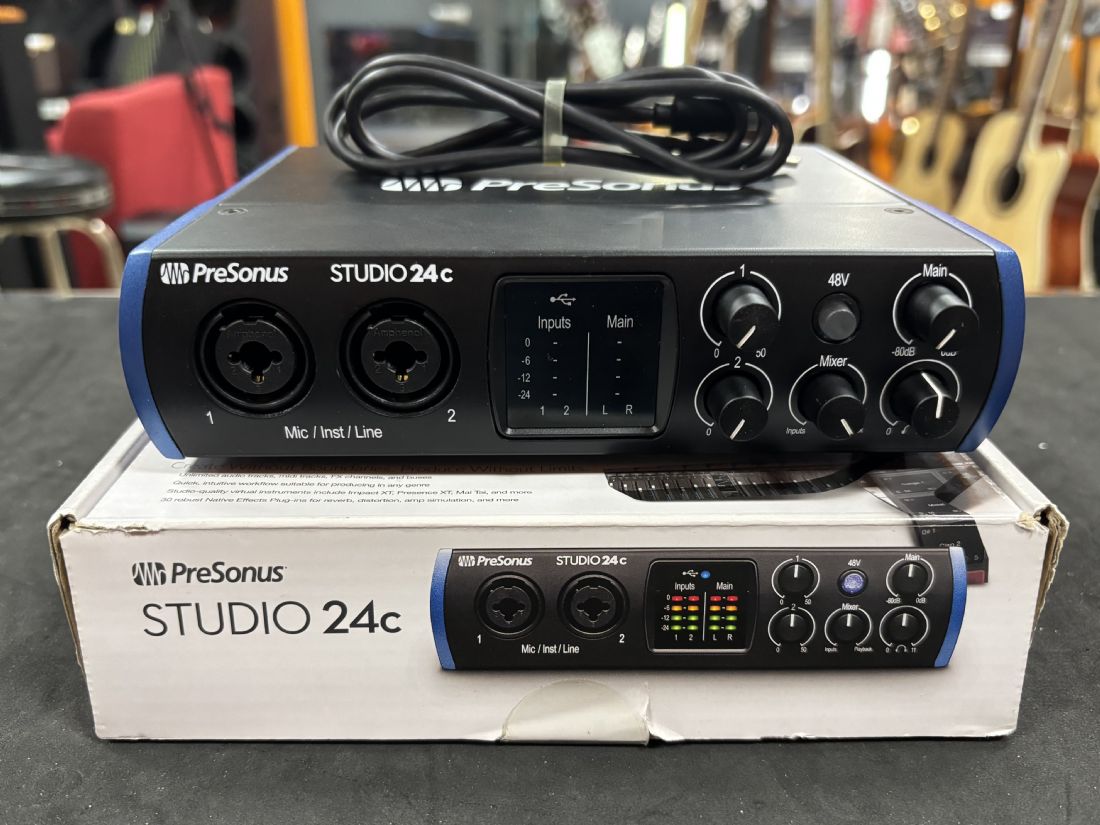 La Presonus Studio 24C è un'interfaccia audio usb-c 2 in/2 out con 2 preamplificatori XMAX-L. Ideale per studi di registrazione, musicisti mobili, chitarristi, podcast e streaming dal vivo, l'interfaccia Studio 24c con bus presenta 2 ingressi combo microfono/linea/strumento con preamplificatori microfonici a stato solido PreSonus XMAX-L, 2 uscite di linea sul pannello posteriore, MIDI I/O e controllo di monitoraggio diretto a bordo.