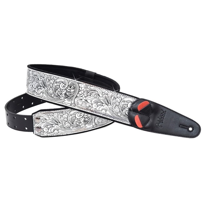 Righton! Straps Revolver Silver: Tracolla realizzata in modo artigianale con materiali ecologici ad alta  tecnologia rispettosi dell’ambiente e priva di qualsiasi tessuto animale, caratterizzata da finitura in sfoglia di alluminio decorata con motivi floreali,imbottitura in lattice ad alta densità (5 mm), sistema di regolazione RAS, porta plettri incorporato.