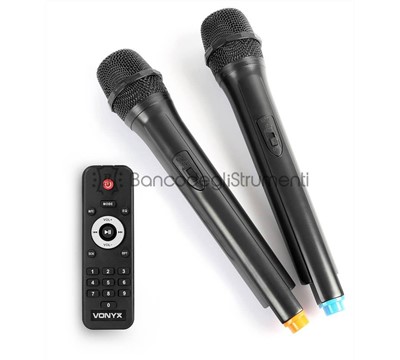 Questo impianto all-in-one è dotato di ricevitore BT per la riproduzione di musica e di trasmettitore bodypack UHF wireless.