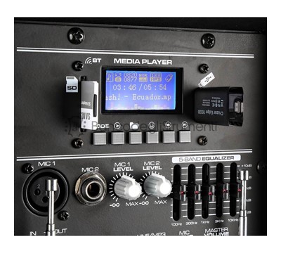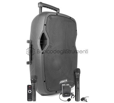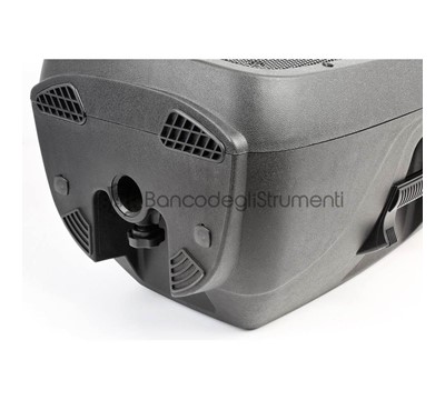 Altoparlante portatile da 12 "600 W. Ricevitore BT per streaming audio 1x UHF body-pack 1x UHF Microfono 1x Microfono a cavo USB integrato, lettore multimediale SD / MMC Indicatore del livello della batteria Effetto eco per tutti i microfoni Driver ad alta compressione Telecomando per lettore MP3 Alimentazione da rete o batteria da 12V Trolley integrato con maniglia telescopica Robusto case in ABS Tophat 35mm