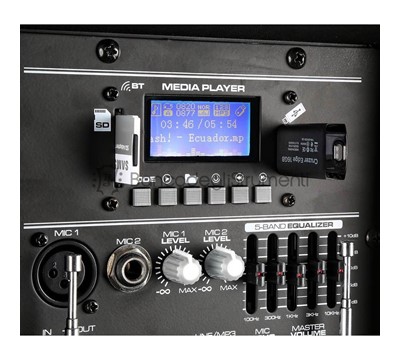 Sul retro ci sono ingressi ed effetto echo per microfoni con cavo, ingresso di linea AUX, unità di controllo MP3, 5 controlli per la regolazione del tono, ecc.