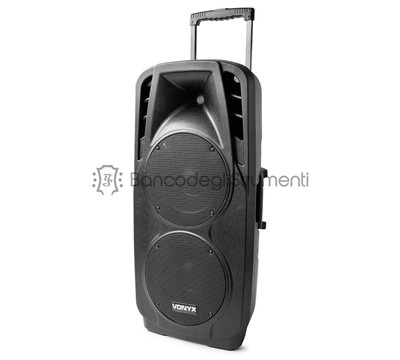 Sistema audio mobile 2x 10 " 2x microfoni UHF wireless Ricevitore BT per lo streaming audio Controllo del volume microfono UHF USB integrato, lettore multimediale SD / MMC Telecomando per lettore MP3 Driver in titanio Alimentazione da rete o da batteria 12Vdc Grande display LCD blu Robusto case in ABS
