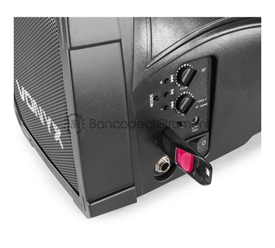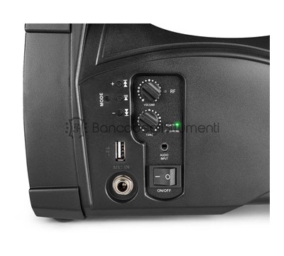 Porta USB per riprodurre le MP3 Streaming audio via BT Microfono palmare UHF 863.100MHz Ingresso jack microfonico da 6.35mm Controllo di volume e tono Batteria ricaricabile da 12V Indicatore di carica Include tracolla