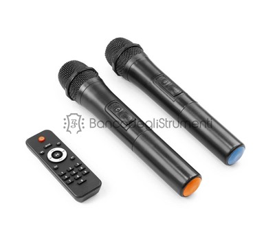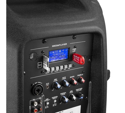 Sistema audio portatile tutto in uno Include 2 microfoni palmari UHF con effetto eco Semplice da configurare e utilizzare Nessun background tecnico richiesto Porta USB e slot per scheda SD e ingresso AUX Potenza massima di 800 W grazie all'amplificazione in classe D ad alte prestazioni Ricevitore BT per lo streaming audio Robusto corpo in plastica ABS resistente agli urti - estremamente durevole Fino a 7 ore di utilizzo continuo con una carica completa della batteria Unità di controllo della batteria con indicatore di stato e di carica Ampio display grafico con tag ID3 (informazioni sul titolo dei file MP3) Equalizzatore a 2 bande Controlli di tono (bassi e alti) e riverbero eco Tirare la maniglia, le ruote e la maniglia per il trasporto per un facile trasporto Staffa di montaggio per treppiede da 35 mm nella base Telecomando completo per lettore multimediale IR-eye nella parte anteriore per un facile controllo
