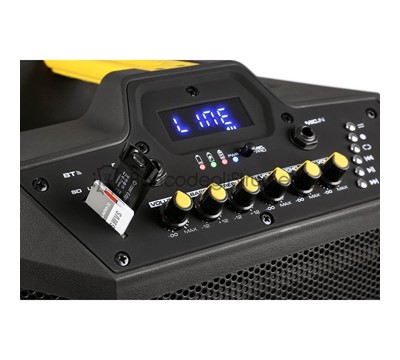Playback options: BT Streaming, SD-Card, USB Output power: Max 250W Battery: 12V - 4.5Ah Frequency Response: 50 - 20.000 Hz Diameter woofer: 10" Input Connections: 6.3 mm jack, RCA Frequency: Handheld microphone 863.200 MHz Power Supply: 100-240VAC 50/60Hz Dimensions (L x W x H): 315 x 290 x 555mm Weight (kg): 9,10