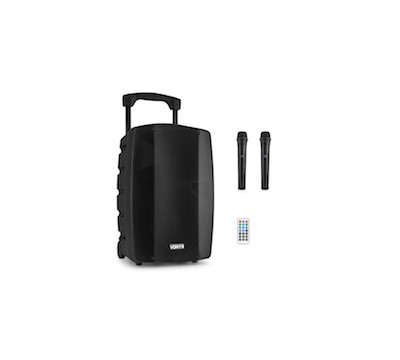 Sistema audio portatile tutto in uno Include 2 microfoni palmari UHF con controllo del volume separato Spazio interno per microfoni e cavi Semplice da configurare e utilizzare: non è richiesta alcuna conoscenza tecnica Porta USB e slot per scheda SD e ingresso AUX Potenza massima in uscita di 200 W tramite amplificazione biamplificata ad alte prestazioni Interfaccia streaming BT 5.0 per lo streaming musicale wireless Robusto corpo in plastica ABS resistente agli urti - estremamente durevole Fino a 20 ore di utilizzo continuo con una carica completa della batteria Centralina batteria con indicatore di stato e carica Ampio display grafico con tag ID3 (informazioni sui titoli dei file MP3) Controlli di tono (bassi e acuti) Maniglia, ruote e maniglia per il trasporto per un facile trasporto Tophat da 35 mm nella base Telecomando completo per lettore multimediale