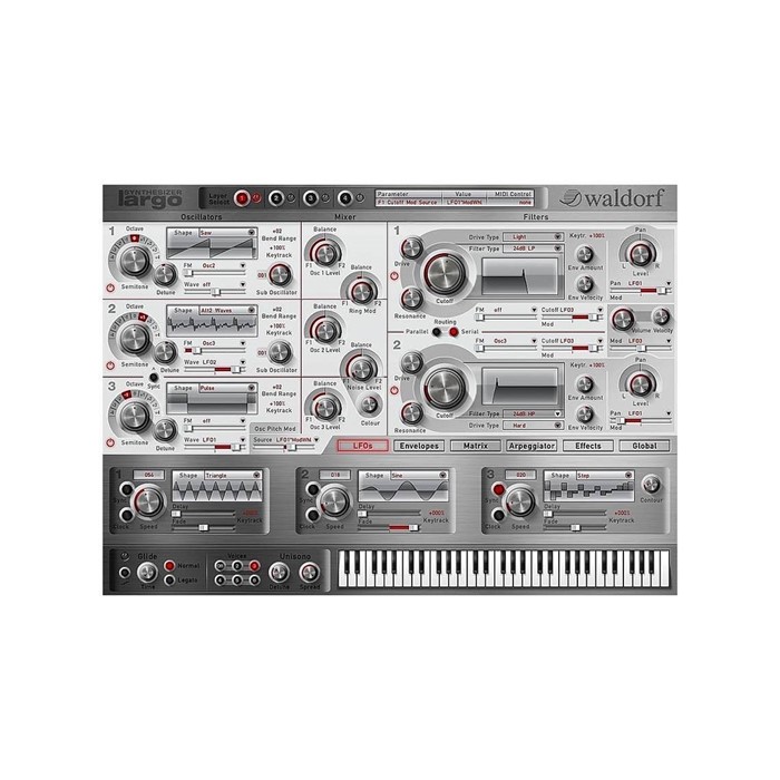 Waldorf Largo: Sintetizzatore software con il DNA Waldorf utilizzato nei sintetizzatori hardware Blofeld e Q, disponibile come plug-in VST/AU/AAX per una facile integrazione con i software DAW più diffusi, caratterizzato da sintesi wavetable e oscillatori analogici virtuali con Sync, Pulsewidth Modulation e Frequency Modulation, premiati filtri Waldorf che generano un suono nitido e graffiante, estese capacità di modulazione, enorme libreria di suoni che copre l'intera gamma dei suoni del sintetizzatore contemporaneo, che include pad lussureggianti, bassi incisivi, cluster sonori spettacolari, suoni lead corposi, rumori digitali taglienti, integrati da complesse scansioni wavetable e linee articolate di arpeggiatori.